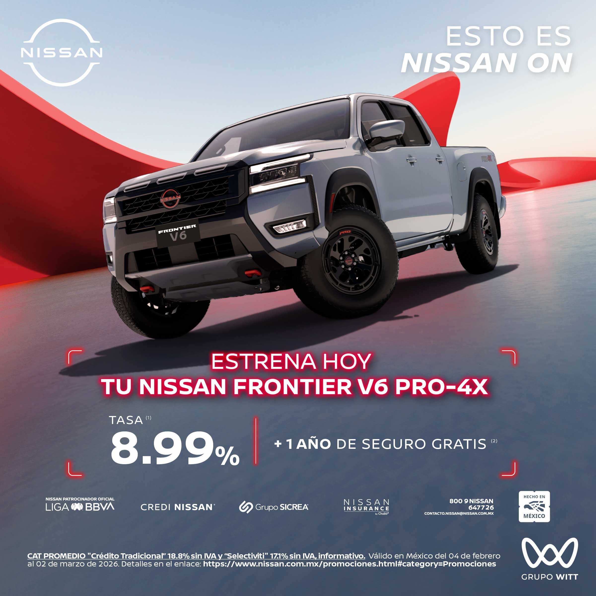 CAT PROMEDIO "Crédito Tradicional" 18.8% sin IVA y "Selectiviti" 17.1% sin IVA, informativo. Valido en México del 04 de febrero al 02 de marzo de 2026. Detalles en el enlace: https://www.nissan.com.mx/promociones.html#category=Promociones