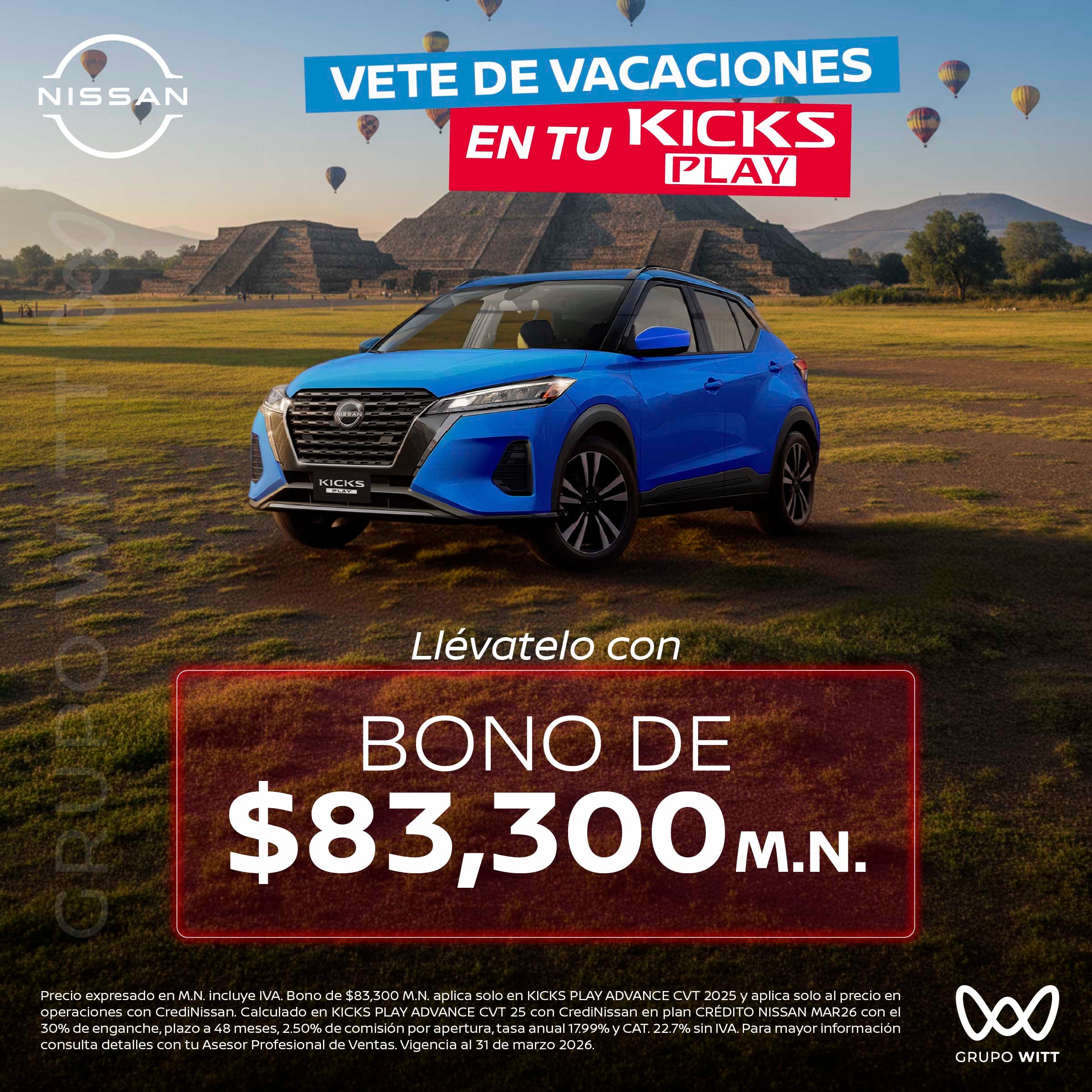 Precio expresado en M.N. incluye IVA. Bono de $83,300 M.N. aplica solo en KICKS PLAY ADVANCE CVT 2025 y aplica solo al precio en operaciones con CrediNissan. Calculado en KICKS PLAY ADVANCE CVT 25 con CrediNissan en plan CRÉDITO NISSAN MAR26 con el 30% de enganche, plazo a 48 meses, 2.50% de comisión por apertura, tasa anual 17.99% y CAT. 22.7% sin IVA. Para mayor información consulta detalles con tu Asesor Profesional de Ventas. Vigencia al 31 de marzo 2026.