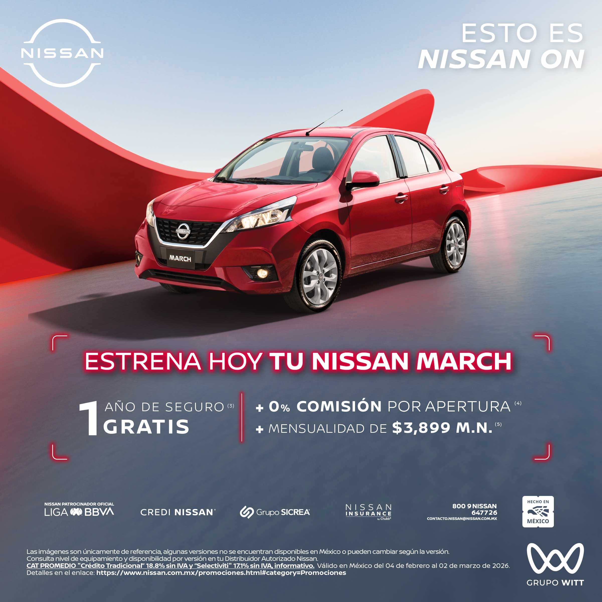 Las imágenes son únicamente de referencia, algunas versiones no se encuentran disponibles en México o pueden cambiar según la versión. Consulta nivel de equipamiento y disponibilidad por versión en tu Distribuidor Autorizado Nissan. CAT PROMEDIO "Crédito Tradicional" 18.8% sin IVA y "Selectiviti" 17.1% sin IVA, informativo. Válido en México del 04 de febrero al 02 de marzo de 2026 Detalles en el enlace: https://www.nissan.com.mx/promociones.html#category=Promociones