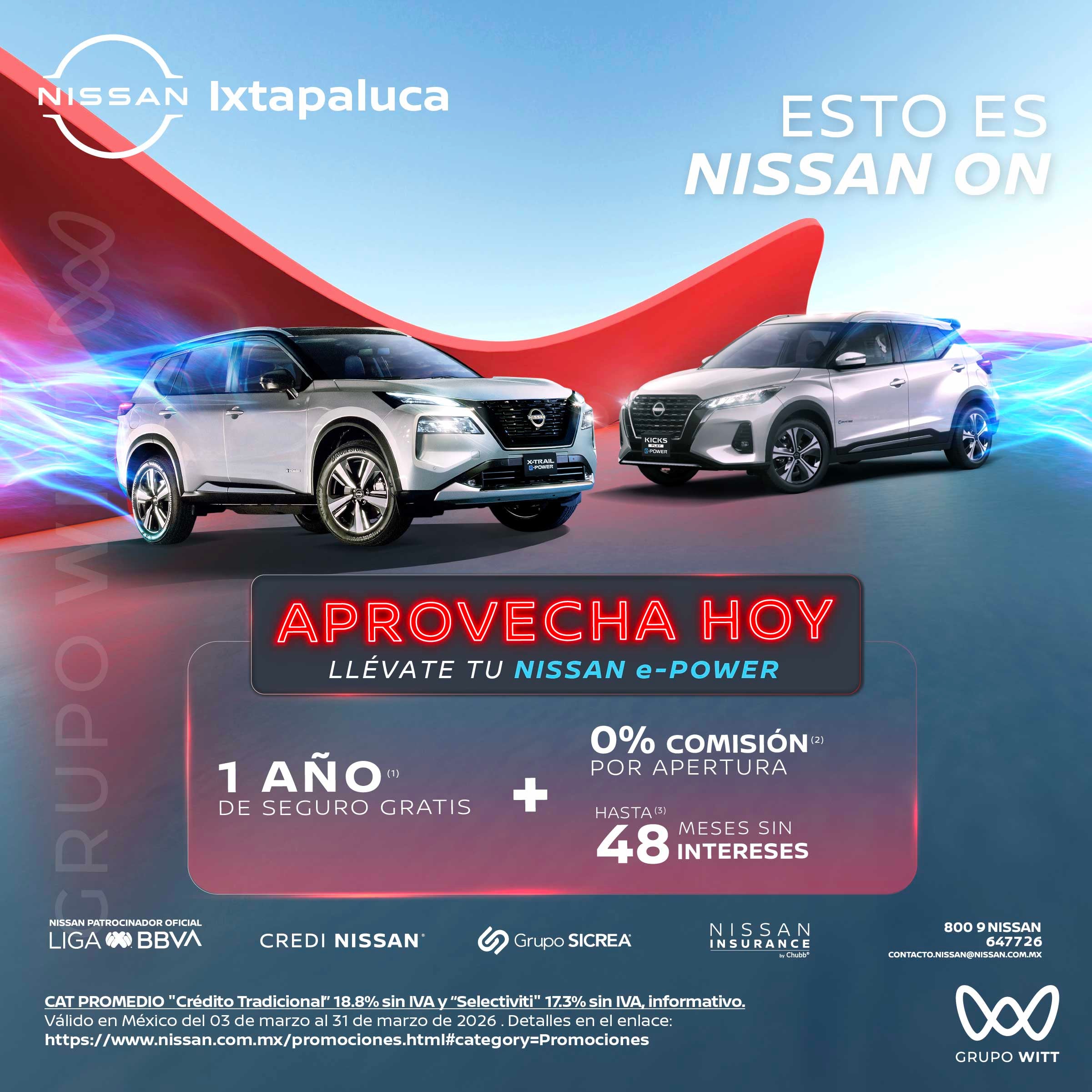 CAT PROMEDIO "Crédito Tradicional" 18.8% sin IVA y "Selectiviti" 17.3% sin IVA, informativo. Válido en México del 03 de marzo al 31 de marzo de 2026. Detalles en el enlace: https://www.nissan.com.mx/promociones.html#category=Promociones