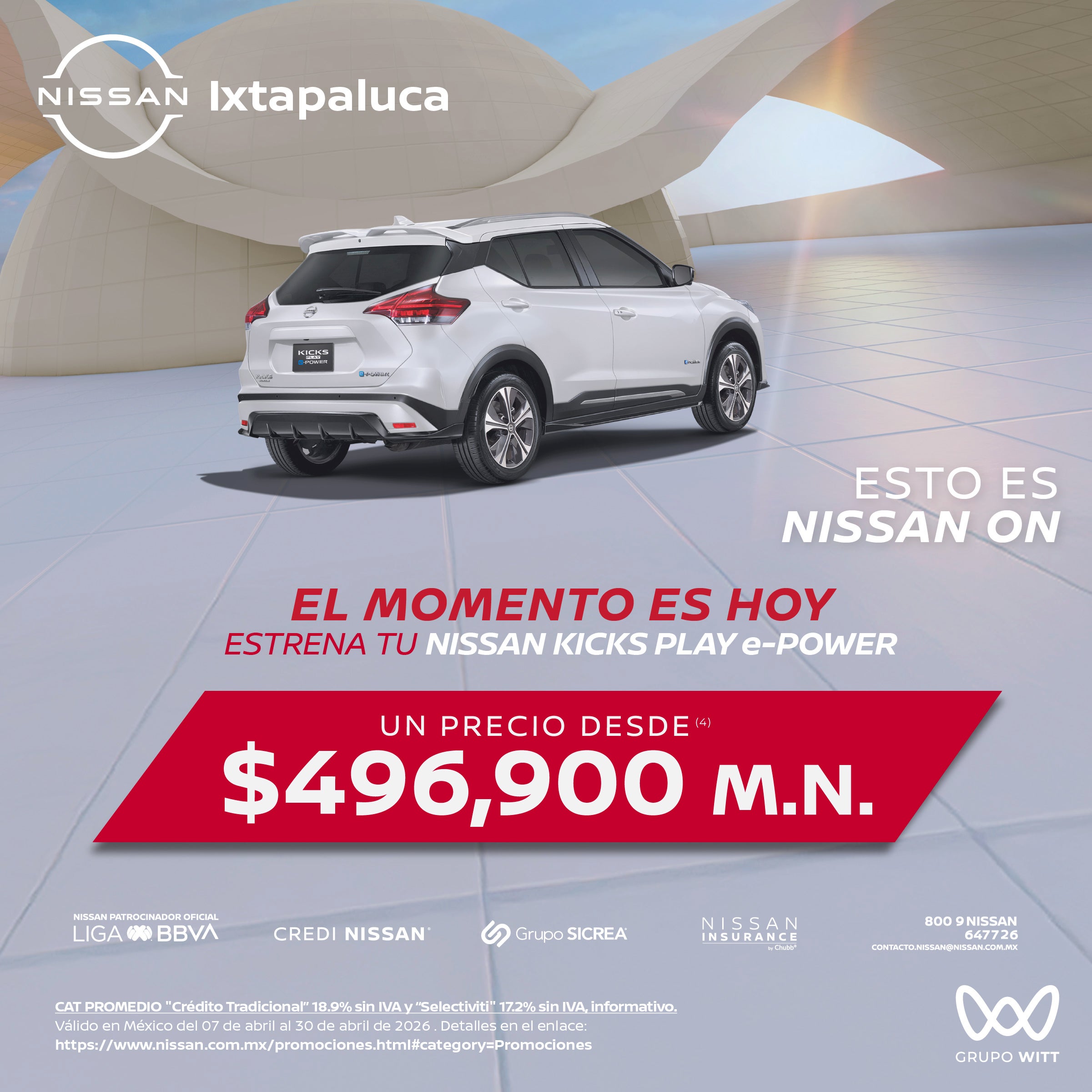 CAT PROMEDIO "Crédito Tradicional" 18.9% sin IVA y "Selectiviti" 17.2% sin IVA, informativo. Válido en México del 07 de abril al 30 de abril de 2026 . Detalles en el enlace: https://www.nissan.com.mx/promociones.html#category=Promociones