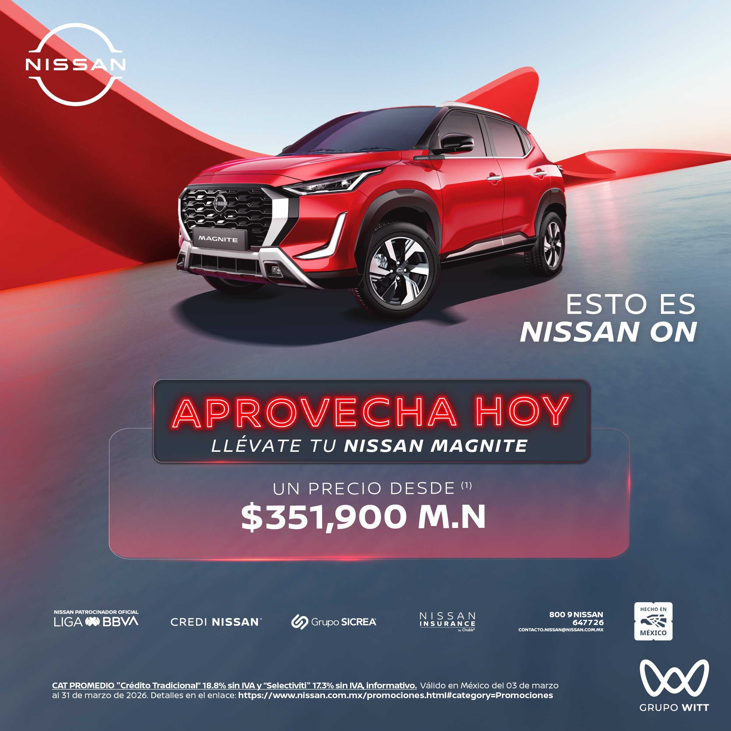 CAT PROMEDIO "Crédito Tradicional" 18.8% sin IVA y "Selectiviti" 17.3% sin IVA, informativo. Válido en México del 03 de marzo al 31 de marzo de 2026. Detalles en el enlace: https://www.nissan.com.mx/promociones.html#category=Promociones
