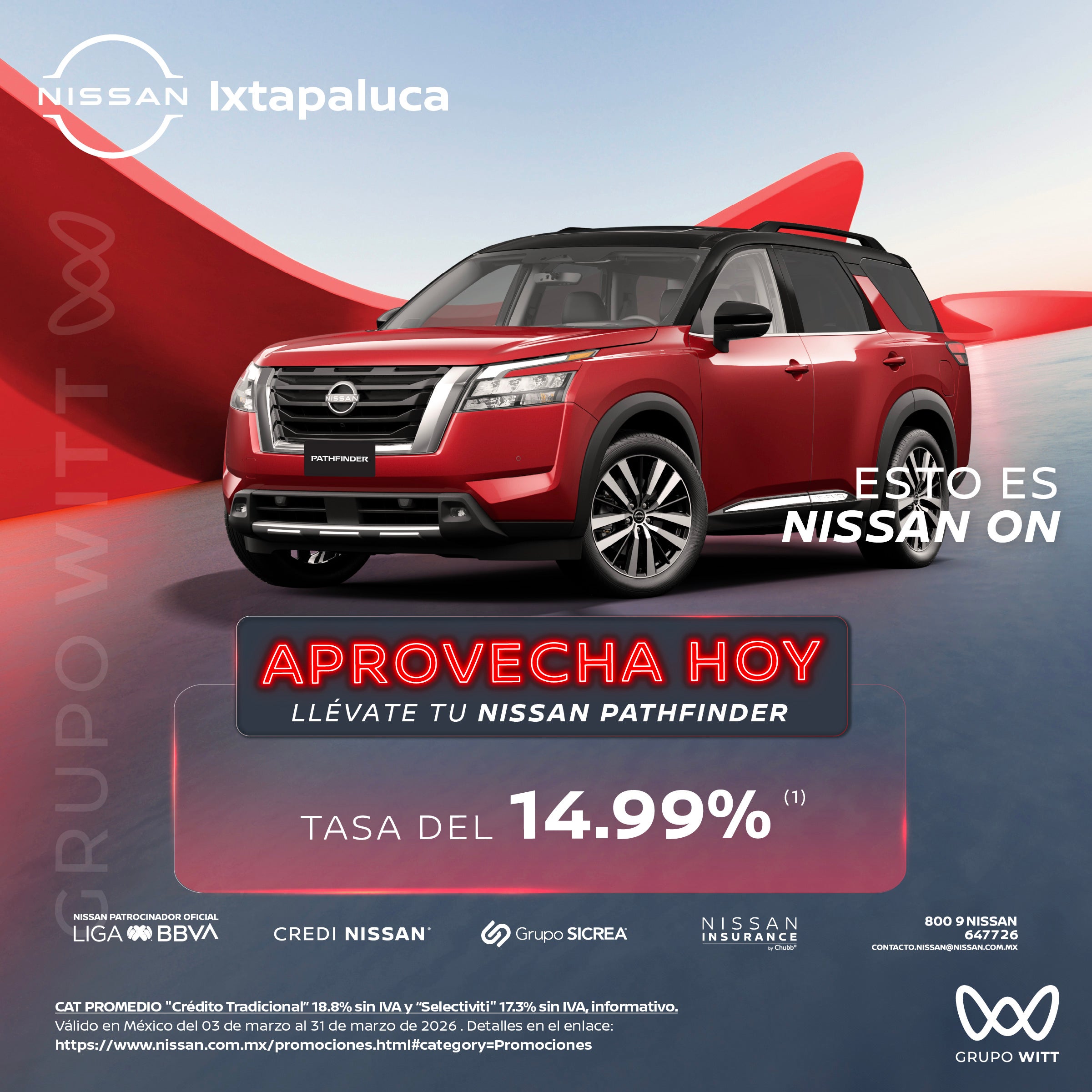 CAT PROMEDIO "Crédito Tradicional" 18.8% sin IVA y "Selectiviti" 17.3% sin IVA, informativo. Válido en México del 03 de marzo al 31 de marzo de 2026. Detalles en el enlace: https://www.nissan.com.mx/promociones.html#category=Promociones