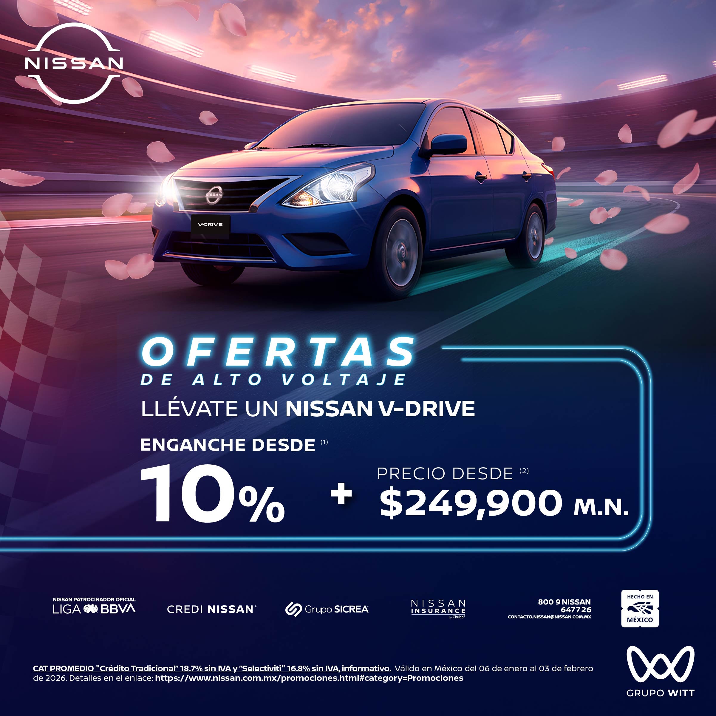 CAT PROMEDIO "Crédito Tradicional" 18.7% sin IVA y "Selectiviti" 16.8% sin IVA, informativo. Valido en México del 06 de enero al 03 de febrero de 2026. Detalles en el enlace: https://www.nissan.com.mx/promociones.html#category=Promociones