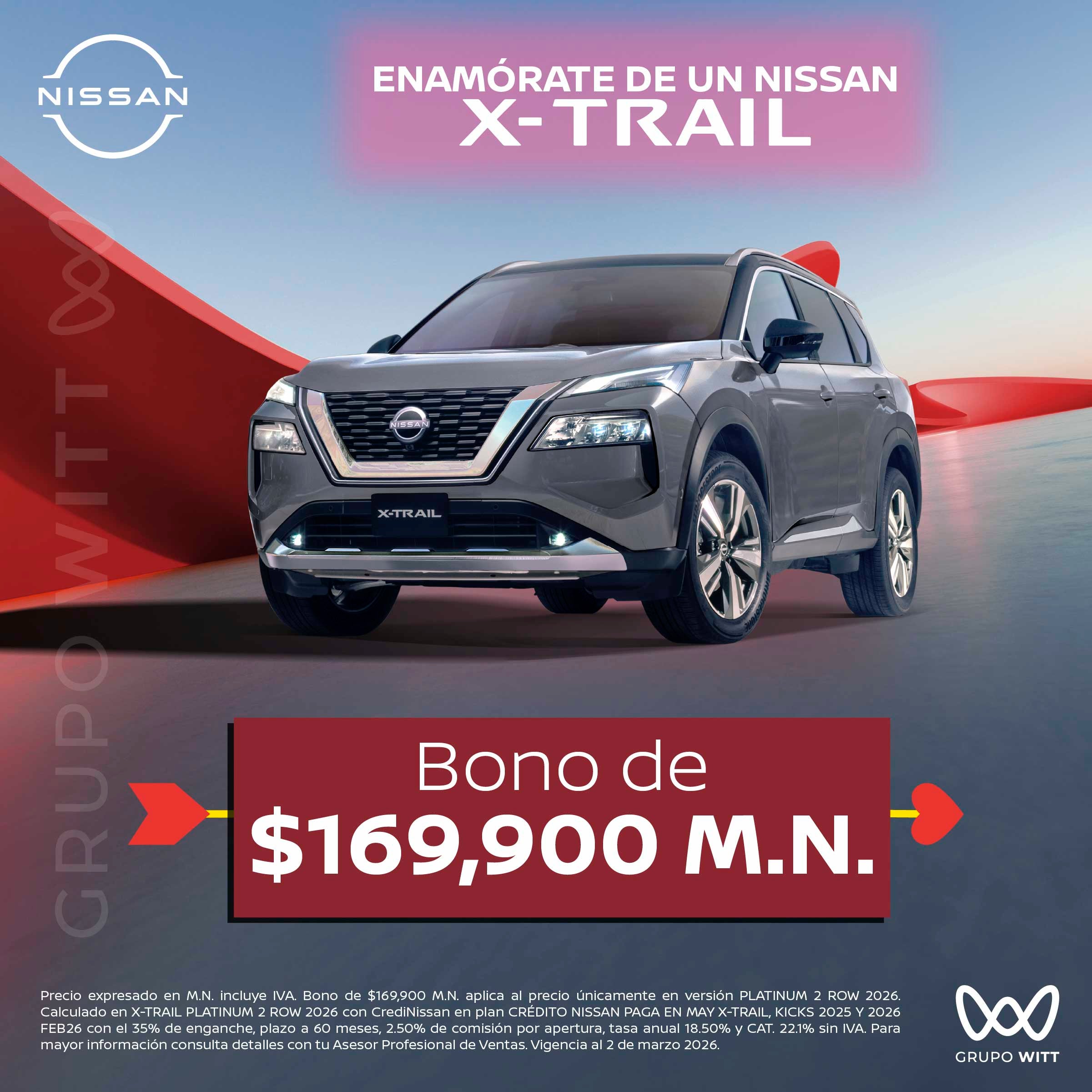 Precio expresado en M.N. incluye IVA. Bono de $169,900 M.N. aplica al precio únicamente en versión PLATINUM 2 ROW 2026. Calculado en X-TRAIL PLATINUM 2 ROW 2026 con CrediNissan en plan CRÉDITO NISSAN PAGA EN MAY X-TRAIL, KICKS 2025 Y 2026 FEB26 con el 35% de enganche, plazo a 60 meses, 2.50% de comisión por apertura, tasa anual 18.50% y CAT. 22.1% sin IVA. Para mayor información consulta detalles con tu Asesor Profesional de Ventas. Vigencia al 2 de marzo 2026.