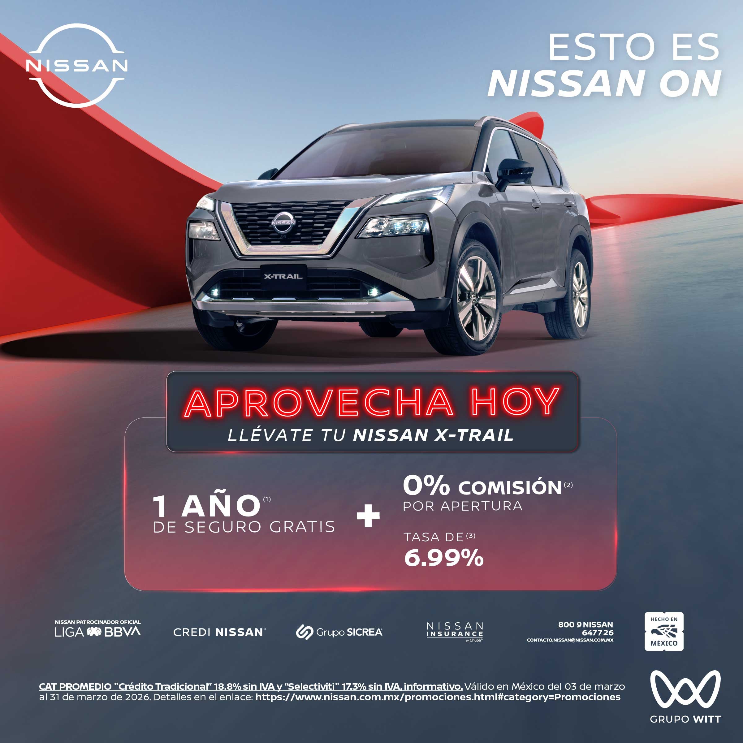 CAT PROMEDIO "Crédito Tradicional" 18.8% sin IVA y "Selectiviti" 17.3% sin IVA, informativo. Válido en México del 03 de marzo al 31 de marzo de 2026. Detalles en el enlace: https://www.nissan.com.mx/promociones.html#category=Promociones
