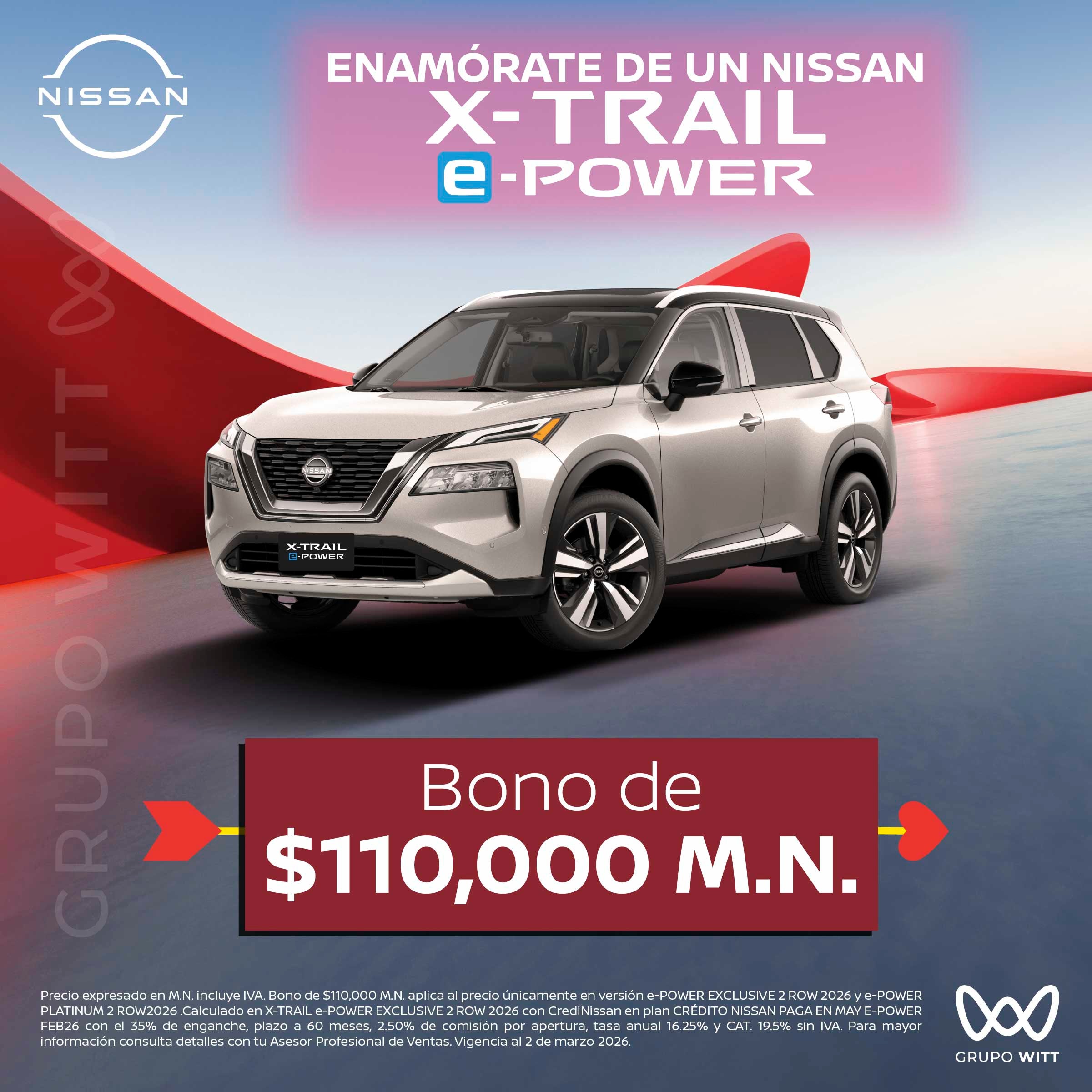 Precio expresado en M.N. incluye IVA. Bono de $110,000 M.N. aplica al precio únicamente en versión e-POWER EXCLUSIVE 2 ROW 2026 y e-POWER PLATINUM 2 ROW2026. Calculado en X TRAIL e-POWER EXCLUSIVE 2 ROW 2026 con CrediNissan en plan CRÉDITO NISSAN PAGA EN MAY E-POWER FEB26 con el 35% de enganche, plazo a 60 meses, 2.50% de comisión por apertura, tasa anual 16.25% y CAT. 19.5% sin IVA. Para mayor información consulta detalles con tu Asesor Profesional de Ventas. Vigencia al 2 de marzo 2026.