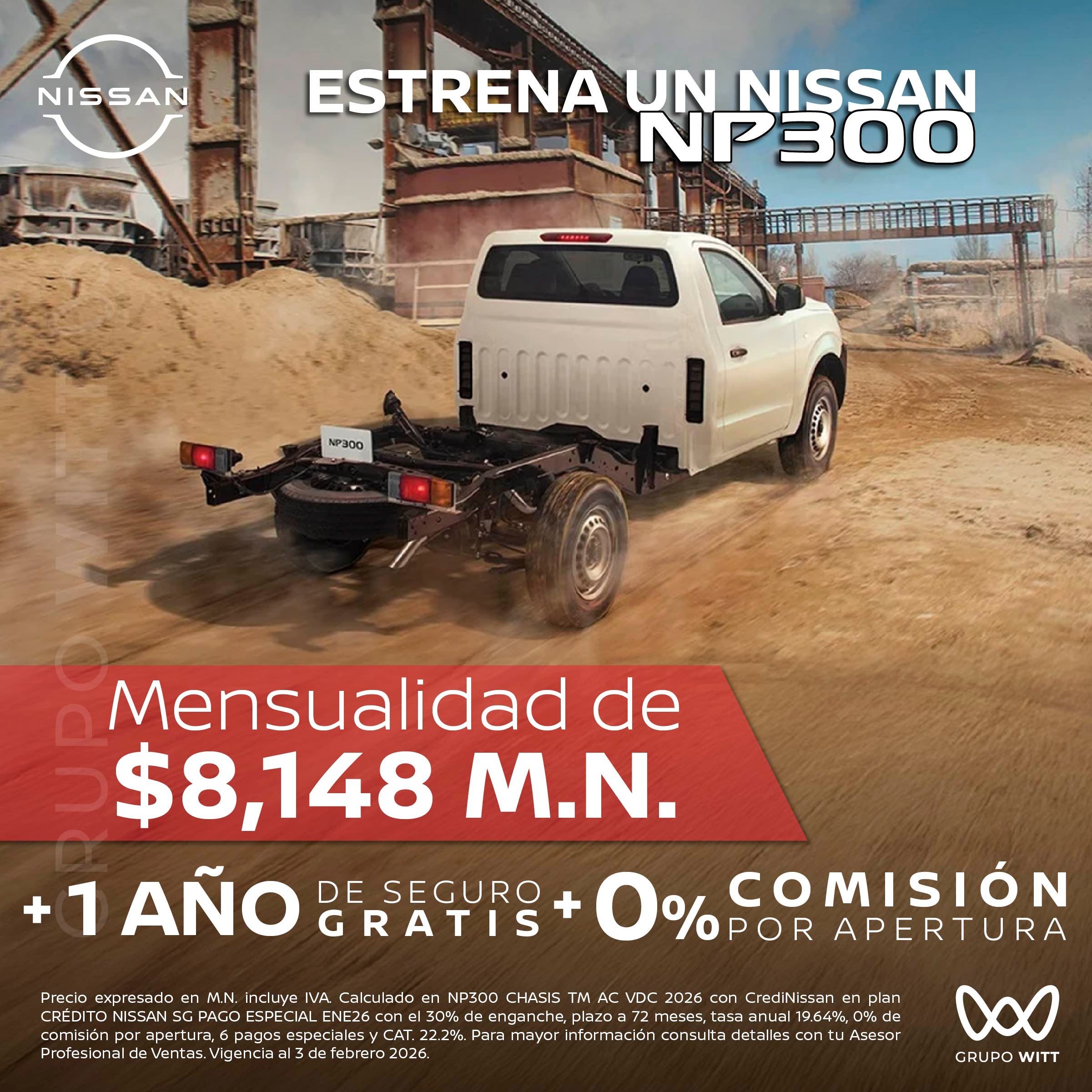 Precio expresado en M.N. incluye IVA. Calculado en NP300 CHASIS TM AC VDC 2026 con CrediNissan en plan CRÉDITO NISSAN SG PAGO ESPECIAL ENE26 con el 30% de enganche, plazo a 72 meses, tasa anual 19.64%, 0% de comisión por apertura, 6 pagos especiales y CAT. 22.2%. Para mayor información consulta detalles con tu Asesor Profesional de Ventas. Vigencia al 3 de febrero 2026.