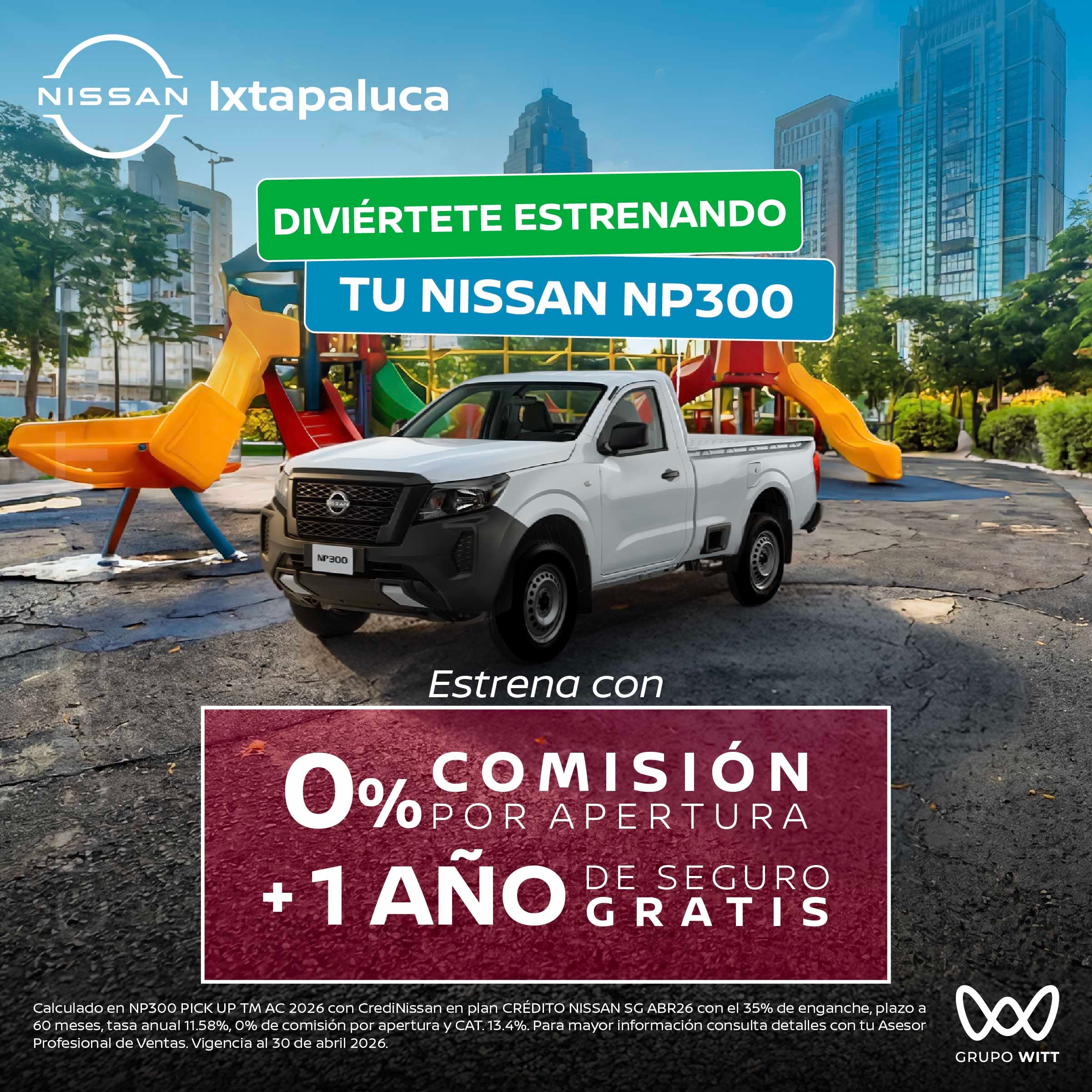 Calculado en NP300 PICK UP TM AC 2026 con CrediNissan en plan CRÉDITO NISSAN SG ABR26 con el 35% de enganche, plazo a 60 meses, tasa anual 11.58%, 0% de comisión por apertura y CAT. 13.4%. Para mayor información consulta detalles con tu Asesor Profesional de Ventas. Vigencia al 30 de abril 2026.