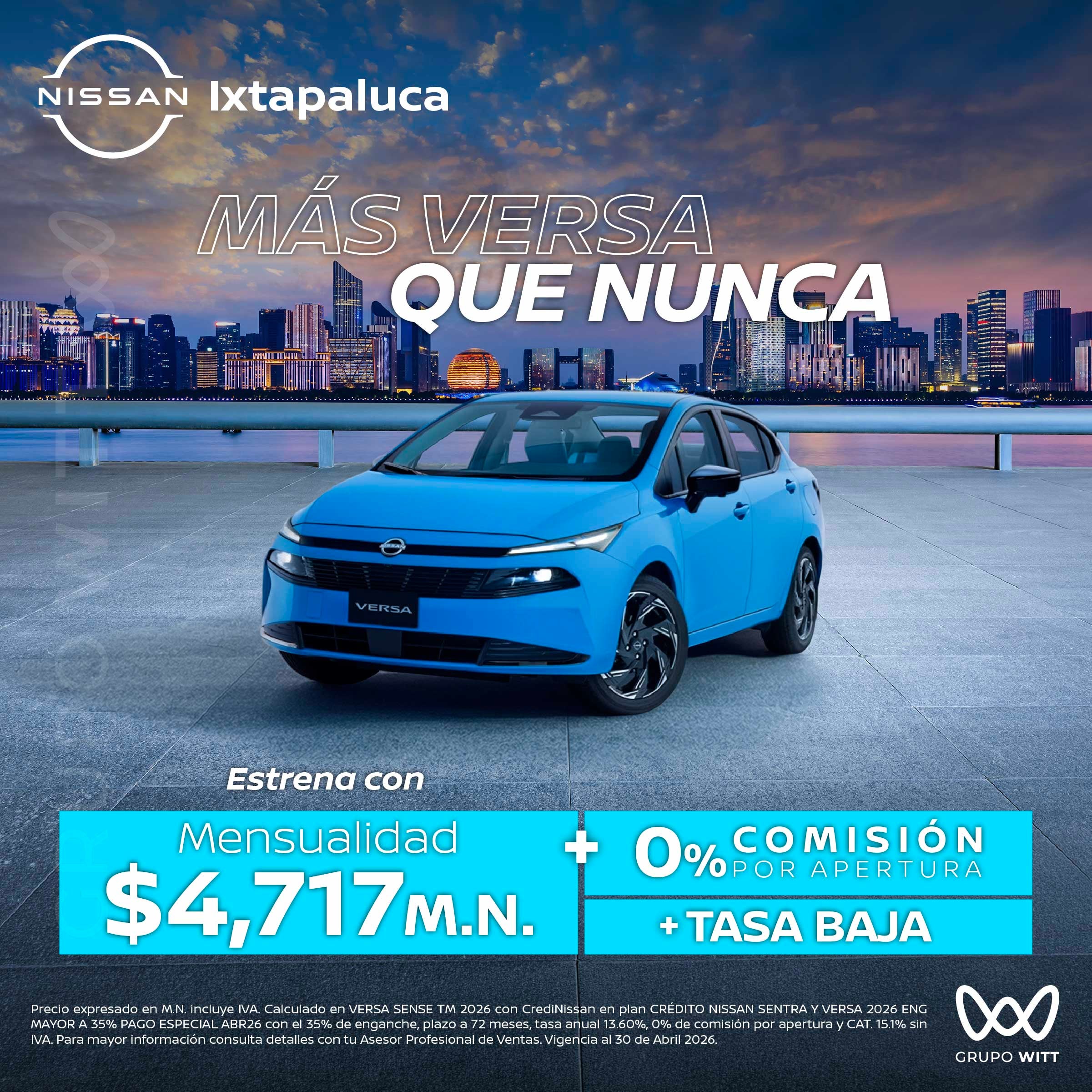 Precio expresado en M.N. incluye IVA. Calculado en VERSA SENSE TM 2026 con CrediNissan en plan CRÉDITO NISSAN SENTRA Y VERSA 2026 ENG MAYOR A 35% PAGO ESPECIAL ABR26 con el 35% de enganche, plazo a 72 meses, tasa anual 13.60%, 0% de comisión por apertura y CAT. 15.1% sin IVA. Para mayor información consulta detalles con tu Asesor Profesional de Ventas. Vigencia al 30 de Abril 2026.