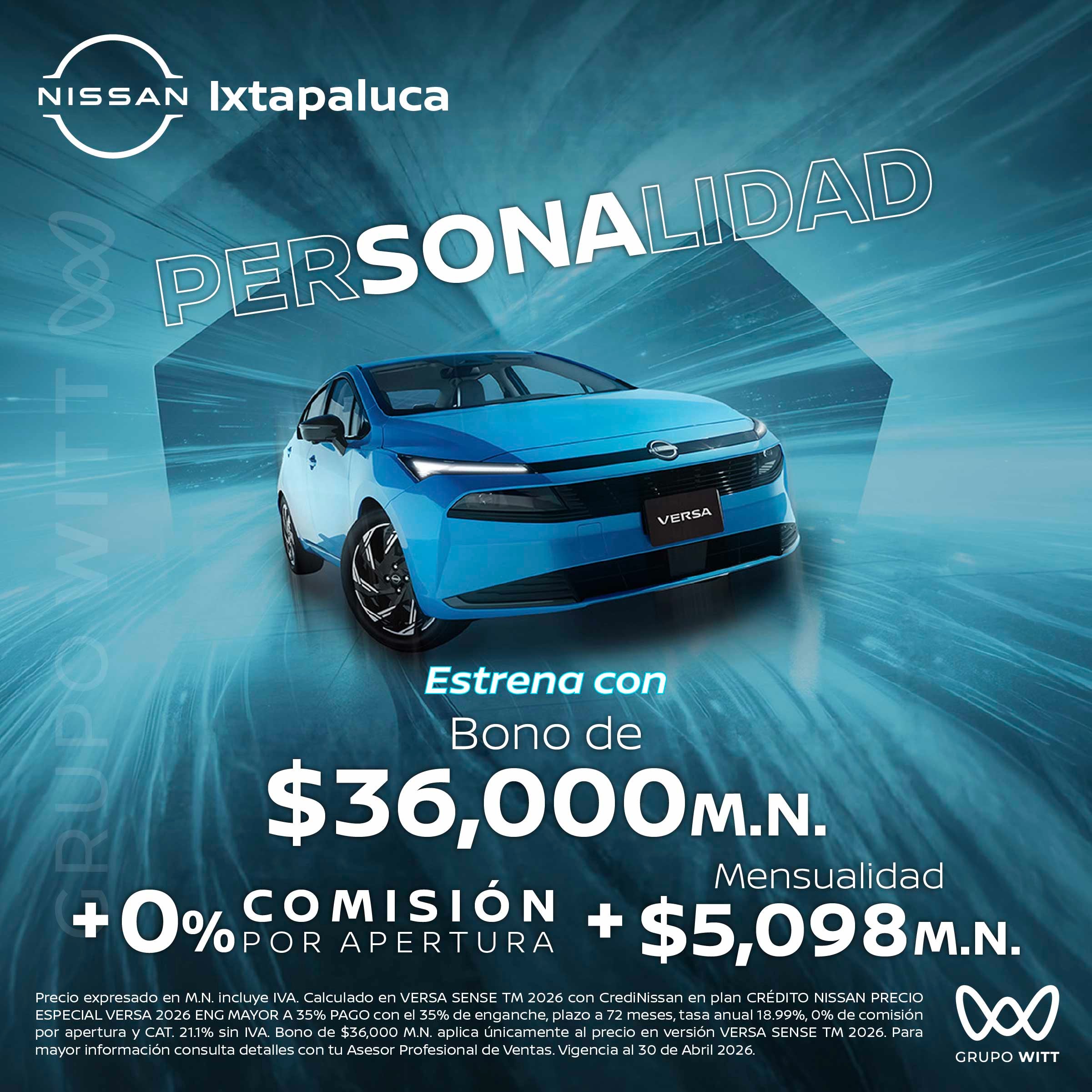 Precio expresado en M.N. incluye IVA. Calculado en VERSA SENSE TM 2026 con CrediNissan en plan CRÉDITO NISSAN PRECIO ESPECIAL VERSA 2026 ENG MAYOR A 35% PAGO con el 35% de enganche, plazo a 72 meses, tasa anual 18.99%, 0% de comisión por apertura y CAT. 21.1% sin IVA. Bono de $36,000 M.N. aplica únicamente al precio en versión VERSA SENSE TM 2026. Para mayor información consulta detalles con tu Asesor Profesional de Ventas. Vigencia al 30 de Abril 2026.