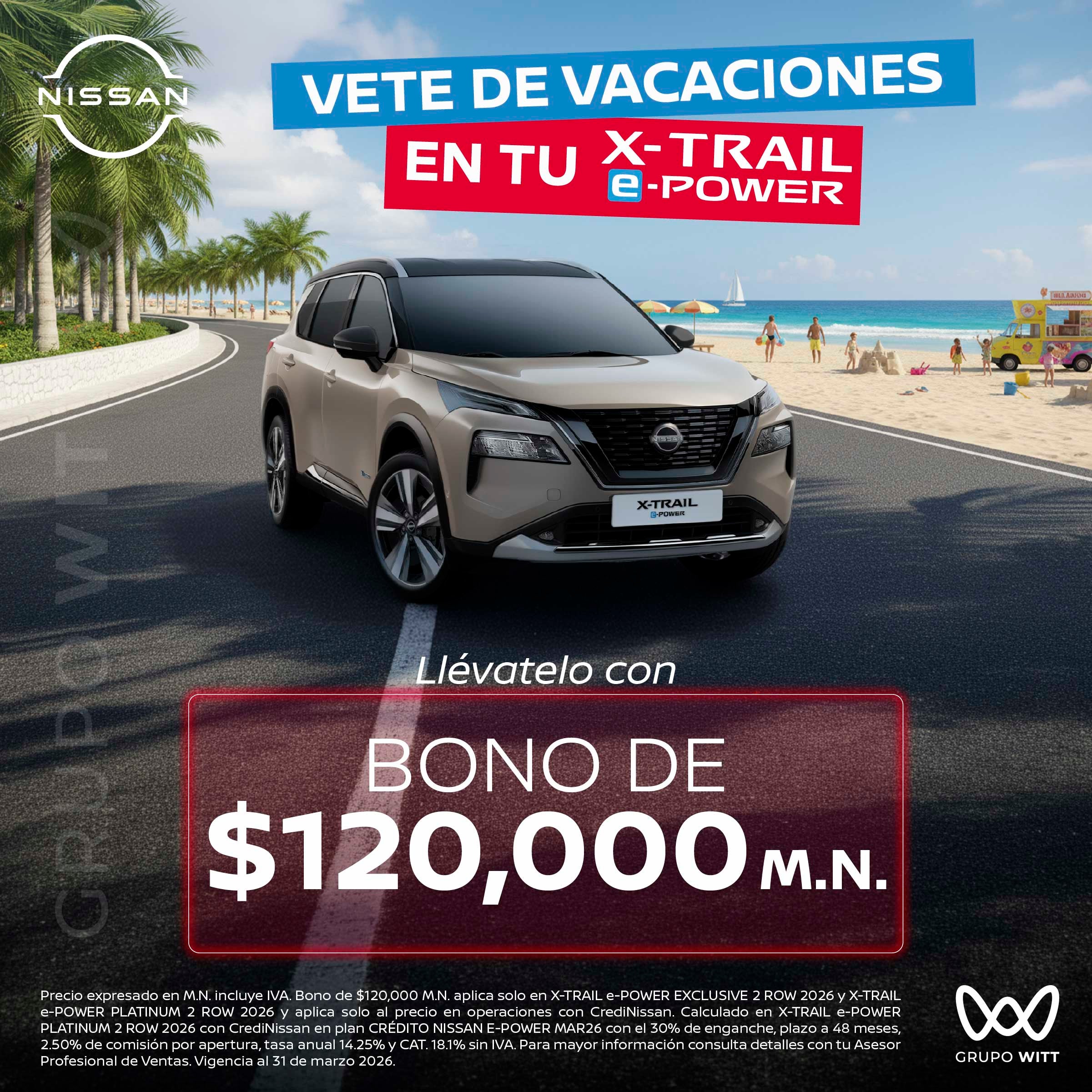 Precio expresado en M.N. incluye IVA. Bono de $120,000 M.N. aplica solo en X-TRAIL e-POWER EXCLUSIVE 2 ROW 2026 y X-TRAIL e-POWER PLATINUM 2 ROW 2026 y aplica solo al precio en operaciones con CrediNissan. Calculado en X TRAIL e-POWER PLATINUM 2 ROW 2026 con CrediNissan en plan CRÉDITO NISSAN E-POWER MAR26 con el 30% de enganche, plazo a 48 meses, 2.50% de comisión por apertura, tasa anual 14.25% y CAT. 18.1% sin IVA. Para mayor información consulta detalles con tu Asesor Profesional de Ventas. Vigencia al 31 de marzo 2026.