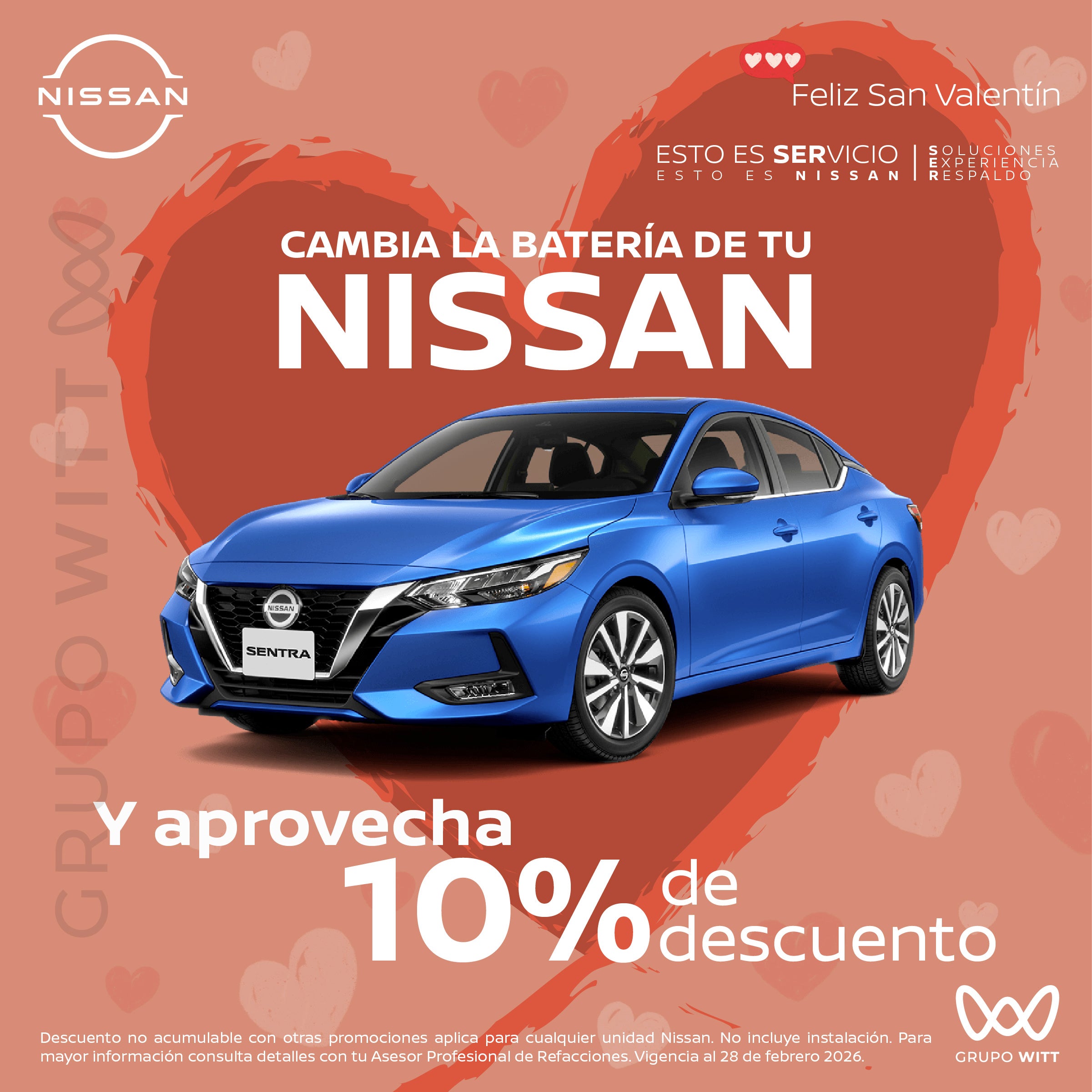 Descuento no acumulable con otras promociones aplica para cualquier unidad Nissan. No incluye instalación. Para mayor información consulta detalles con tu Asesor Profesional de Refacciones. Vigencia al 28 de febrero 2026.