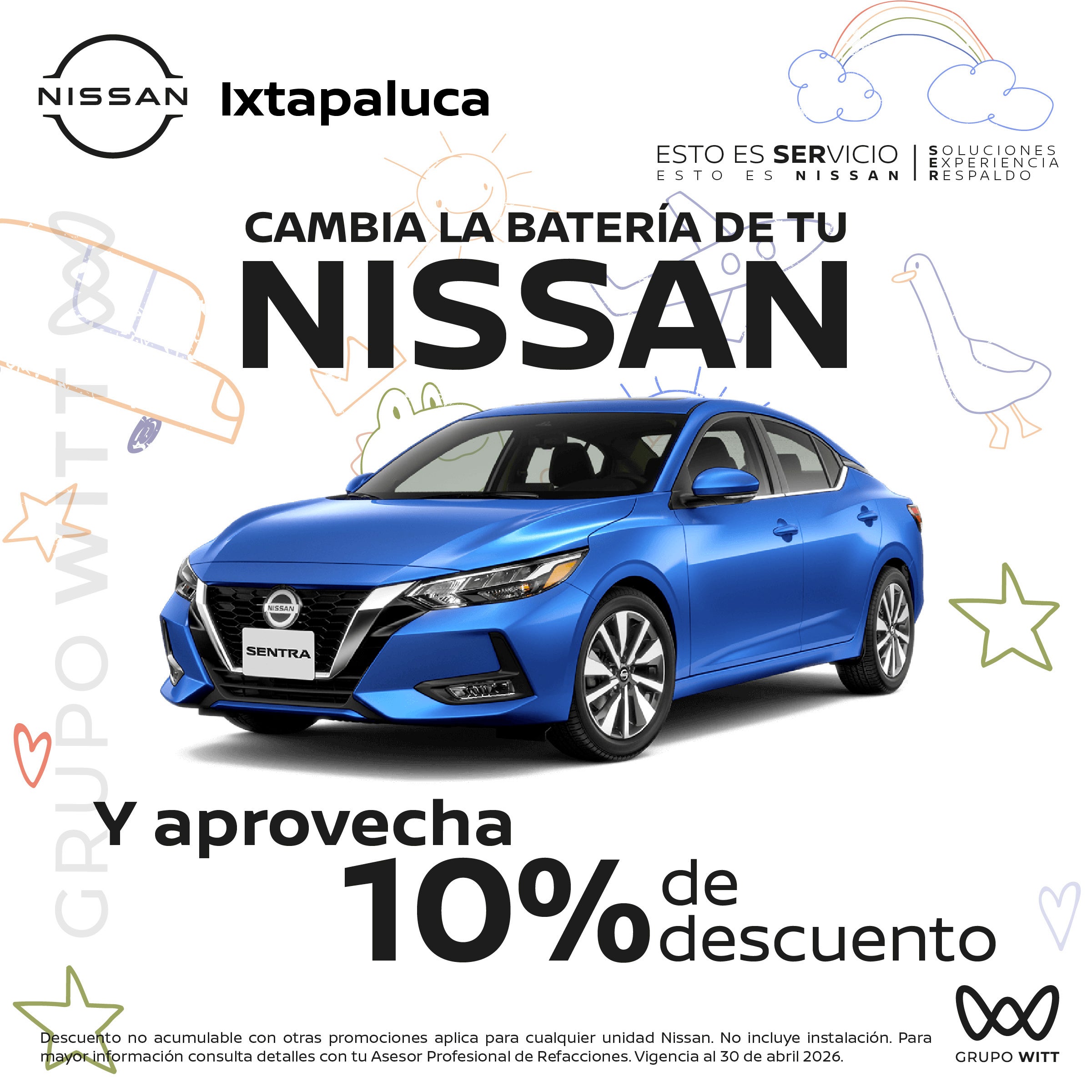 Descuento no acumulable con otras promociones aplica para cualquier unidad Nissan. No incluye instalación. Para mayor información consulta detalles con tu Asesor Profesional de Refacciones. Vigencia al 30 de abril 2026.