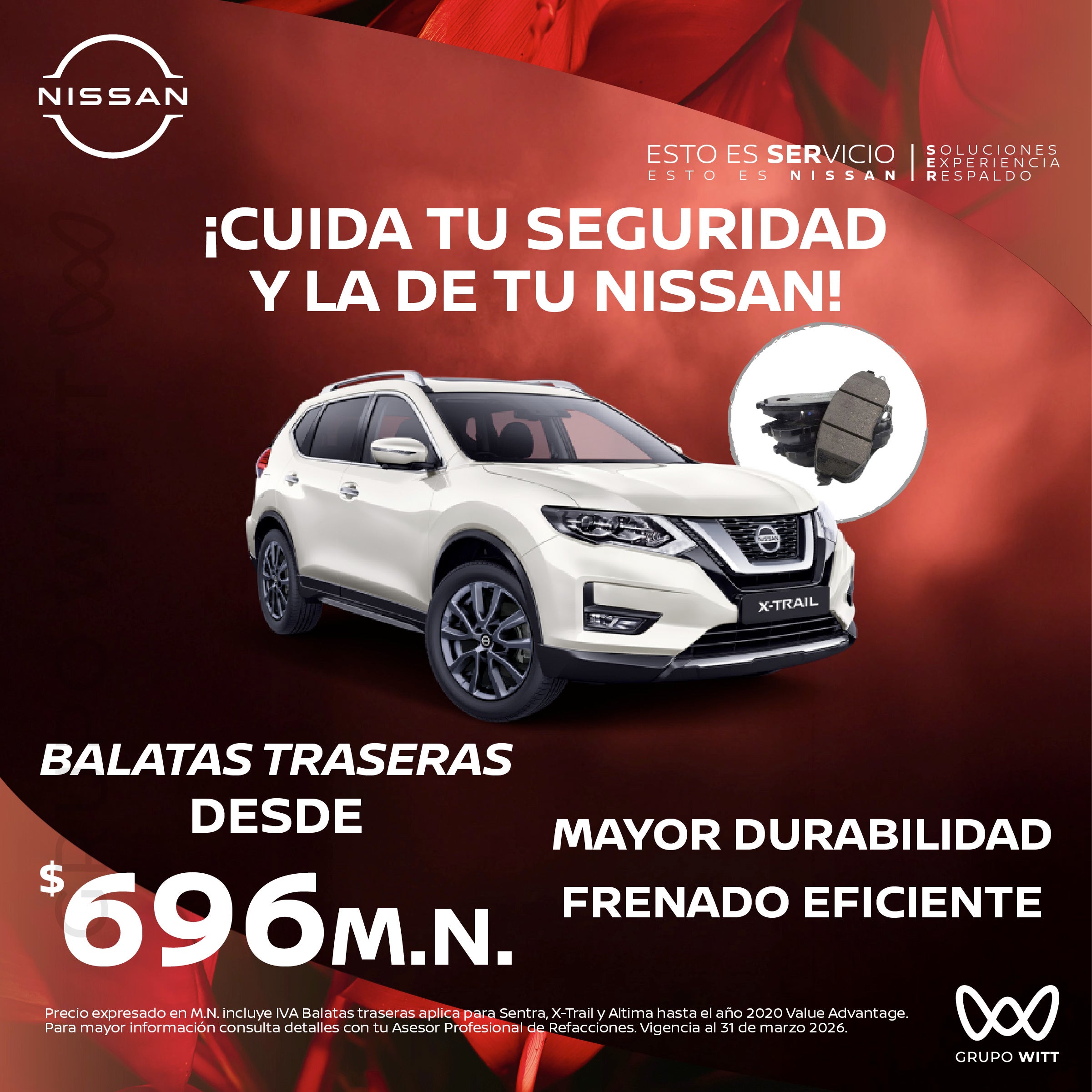 Precio expresado en M.N. incluye IVA Balatas traseras aplica para Sentra, X-Trail y Altima hasta el año 2020 Value Advantage. Para mayor información consulta detalles con tu Asesor Profesional de Refacciones. Vigencia al 31 de marzo 2026.