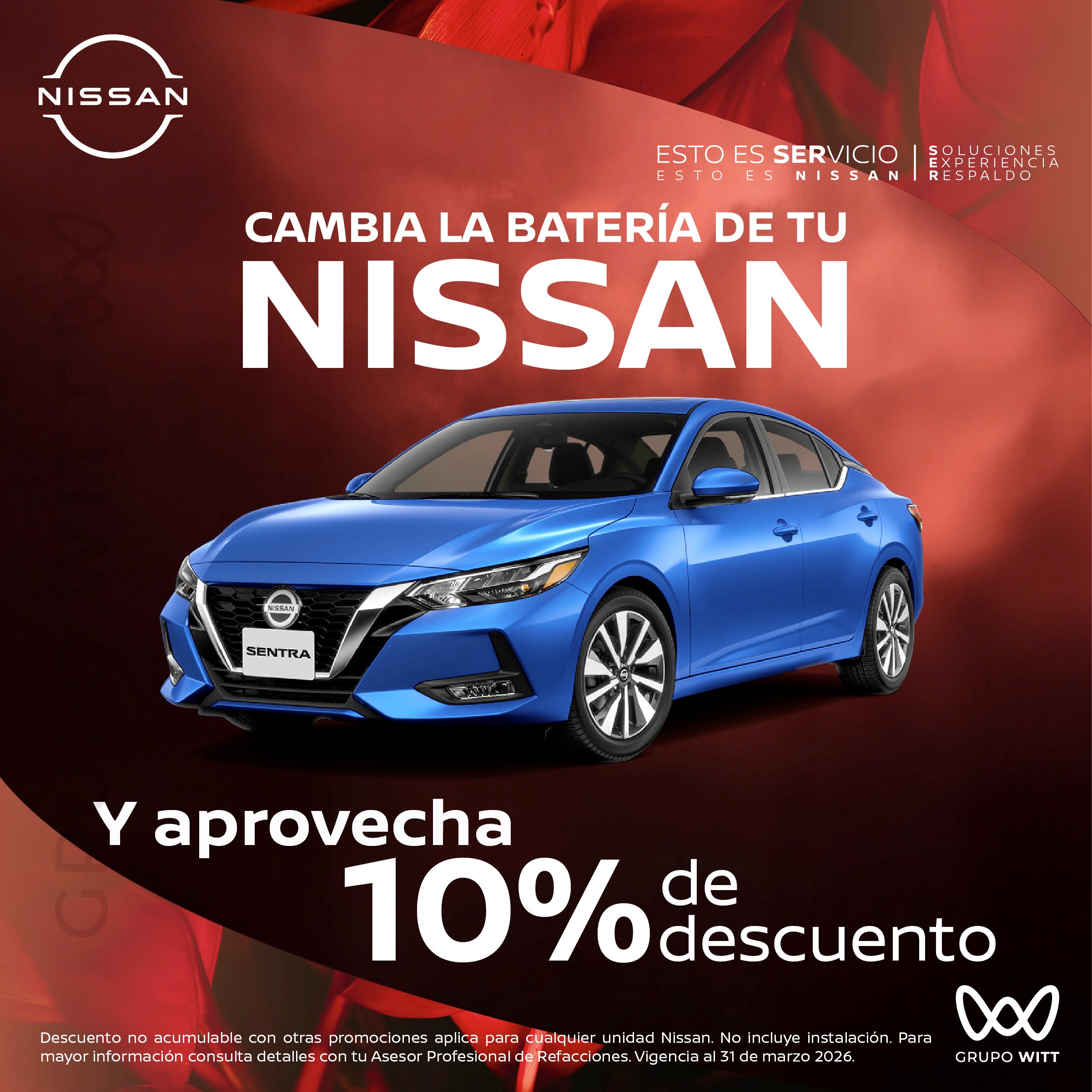 Descuento no acumulable con otras promociones aplica para cualquier unidad Nissan. No incluye instalación. Para mayor información consulta detalles con tu Asesor Profesional de Refacciones. Vigencia al 31 de marzo 2026.