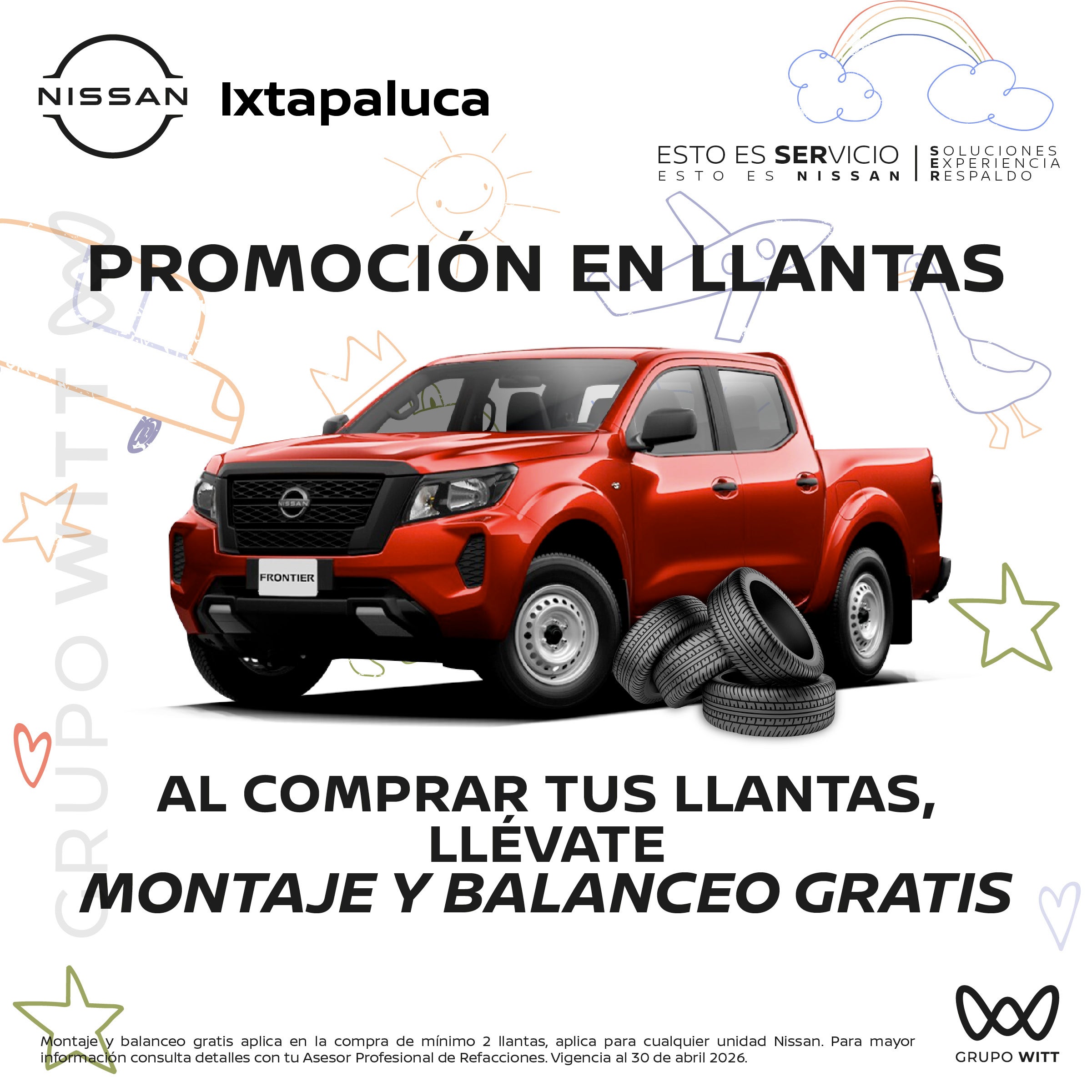 Montaje y balanceo gratis aplica en la compra de mínimo 2 llantas, aplica para cualquier unidad Nissan. Para mayor información consulta detalles con tu Asesor Profesional de Refacciones. Vigencia al 30 de abril 2026.