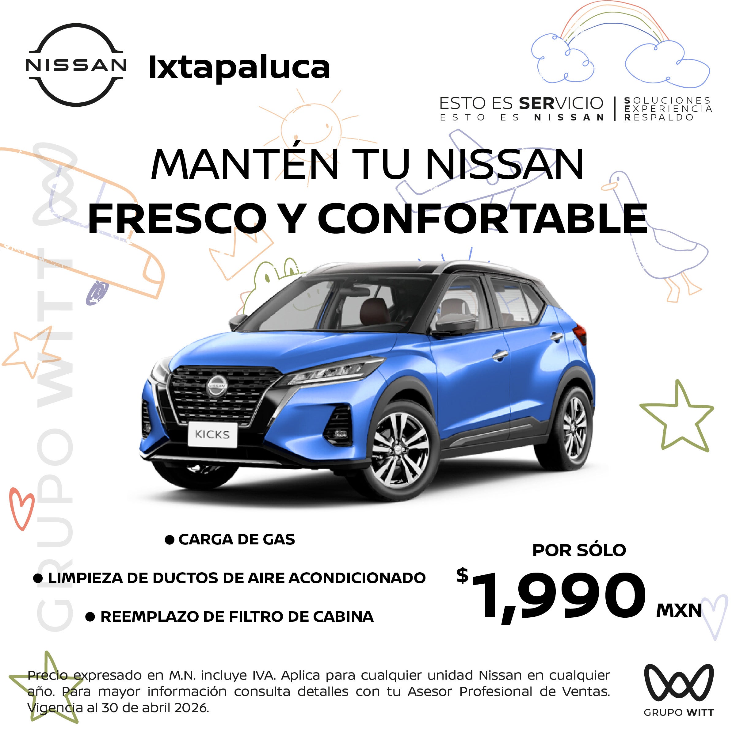 Precio expresado en M.N. incluye IVA. Aplica para cualquier unidad Nissan en cualquier año. Para mayor información consulta detalles con tu Asesor Profesional de Ventas. Vigencia al 30 de abril 2026.