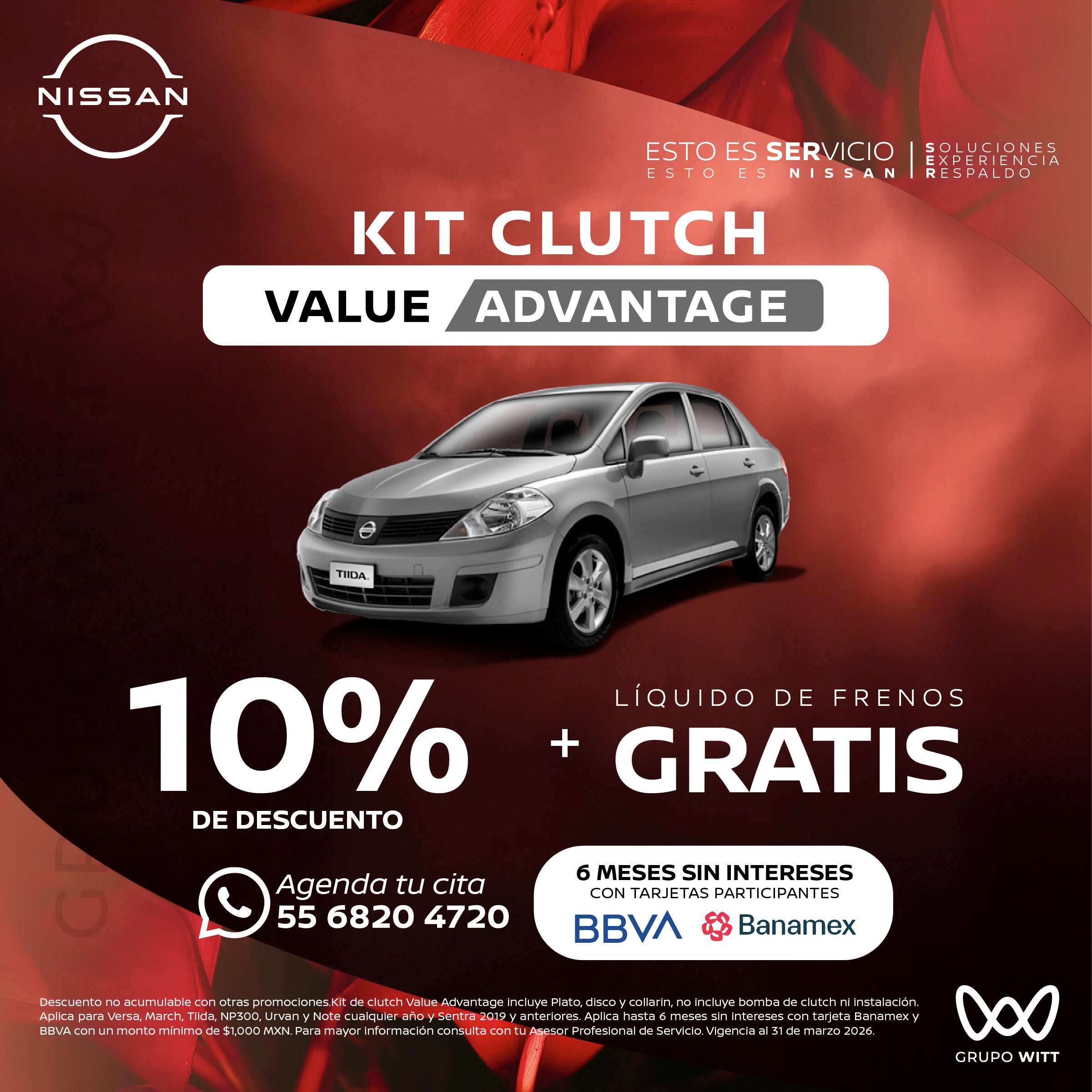 Descuento no acumulable con otras promociones. Kit de clutch Value Advantage incluye Plato, disco y collarín, no incluye bomba de clutch ni instalación. Aplica para Versa, March, Tiida, NP300, Urvan y Note cualquier ano y Sentra 2019 y anteriores. Aplica hasta 6 meses sin intereses con tarjeta Banamex y BBVA con un monto mínimo de $1,000 MXN. Para mayor información consulta con tu Asesor Profesional de Servicio. Vigencia al 31 de marzo 2026.