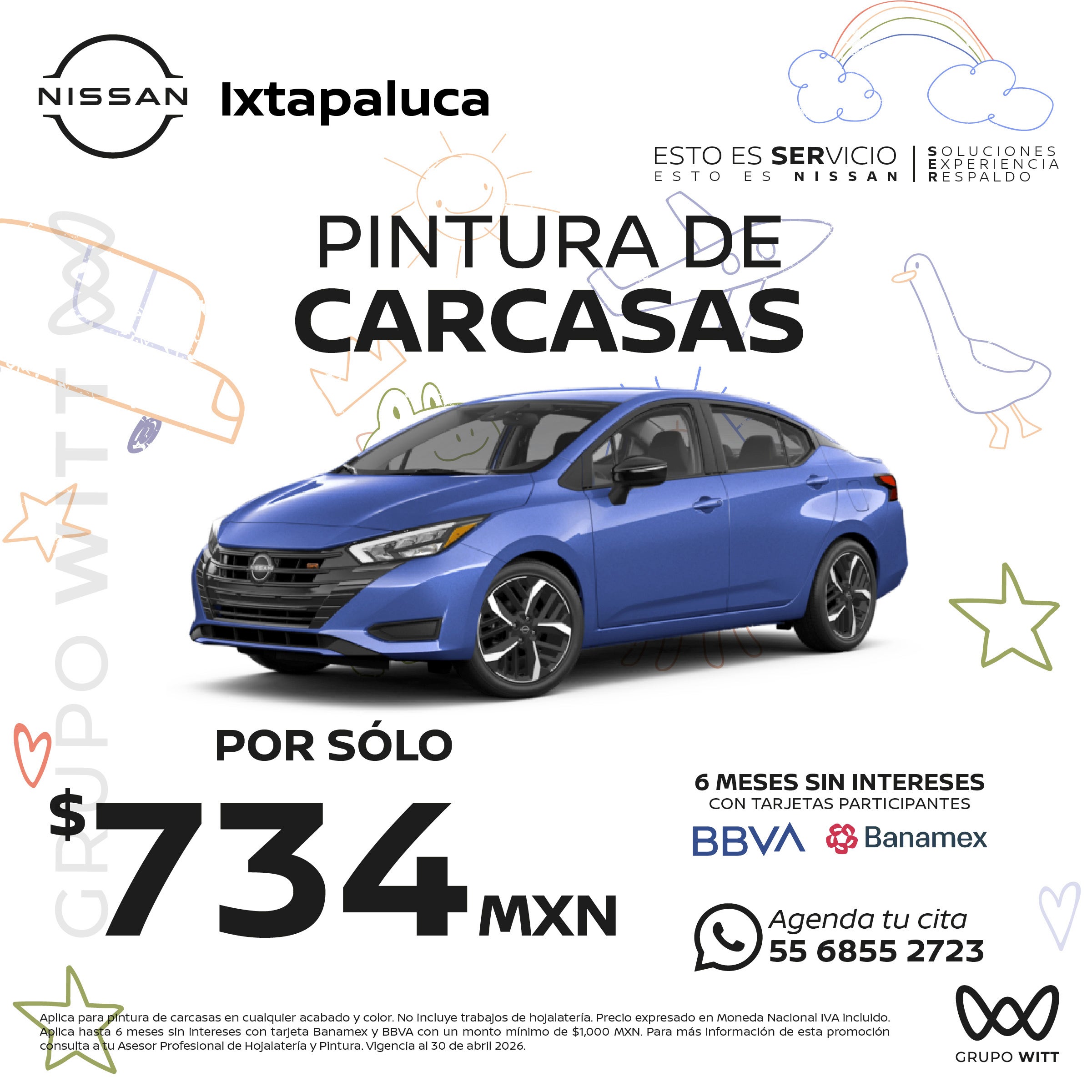 Aplica para pintura de carcasas en cualquier acabado y color. No incluye trabajos de hojalatería. Precio expresado en Moneda Nacional IVA incluido. Aplica hasta 6 meses sin intereses con tarjeta Banamex y BBVA con un monto mínimo de $1,000 MXN. Para más información de esta promoción consulta a tu Asesor Profesional de Hojalatería y Pintura. Vigencia al 30 de abril 2026.