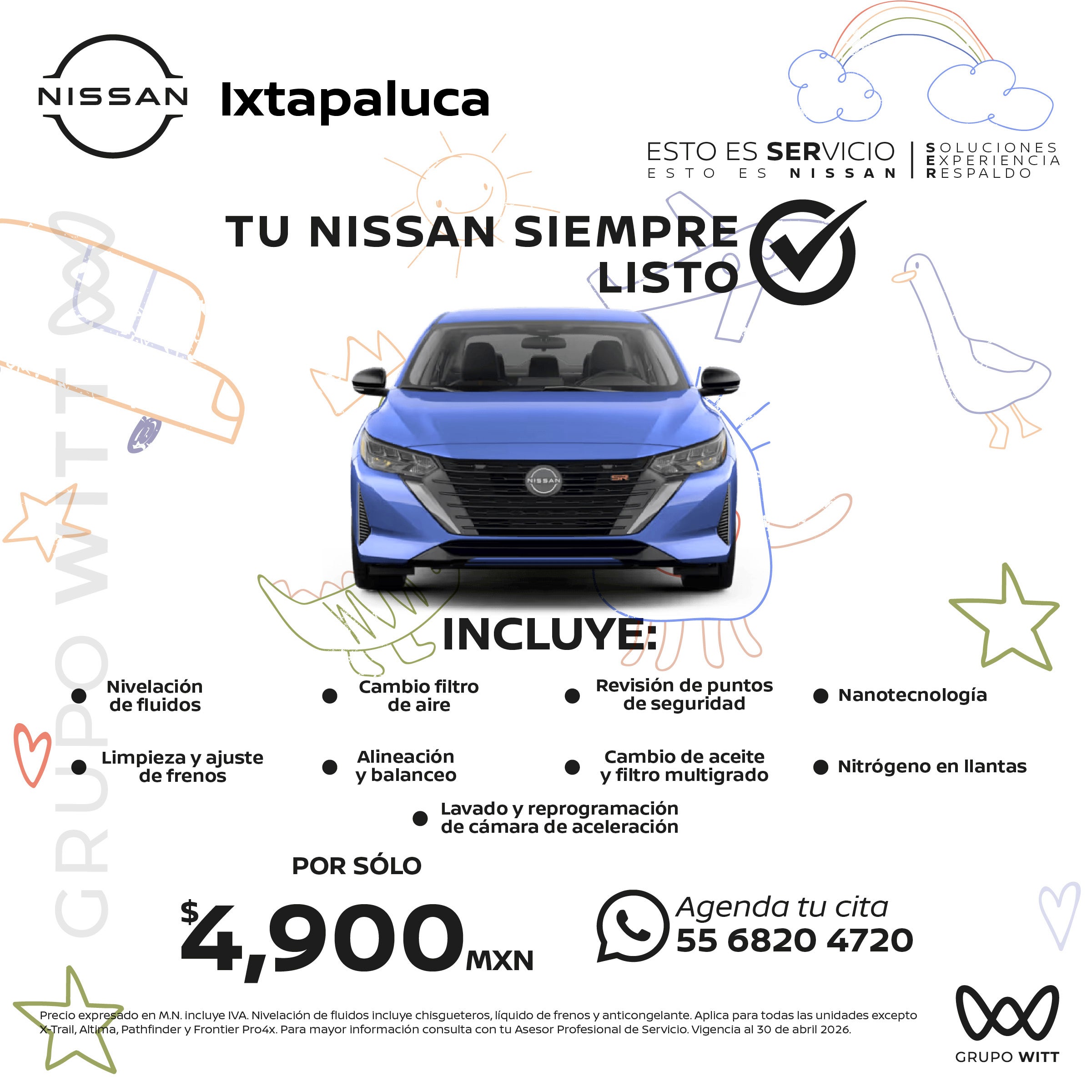 Precio expresado en M.N. incluye IVA. Nivelación de fluidos incluye chisgueteros, líquido de frenos y anticongelante. Aplica para todas las unidades excepto X-Trail, Altima, Pathfinder y Frontier Pro4x. Para mayor información consulta con tu Asesor Profesional de Servicio. Vigencia al 30 de abril 2026.