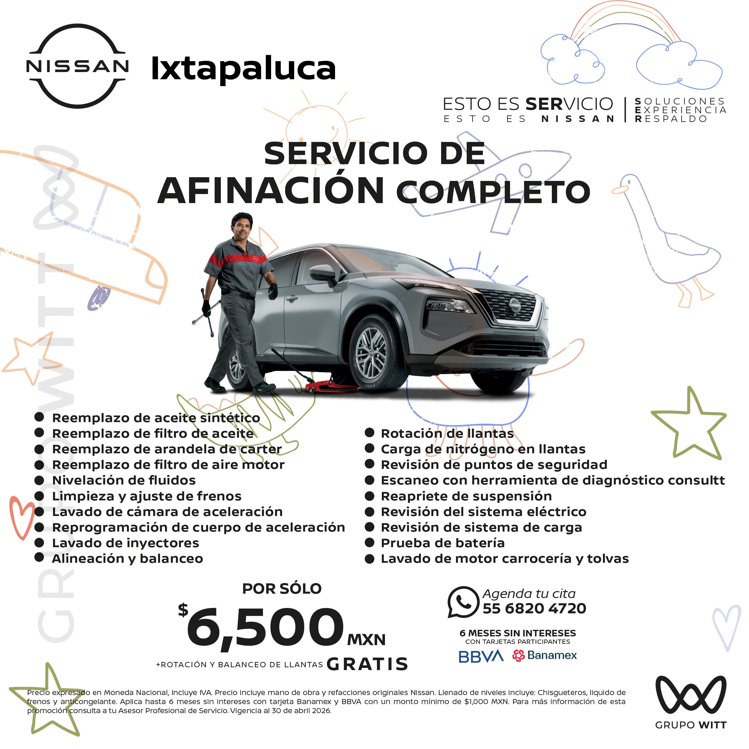 Precio expresado en Moneda Nacional, Incluye IVA. Precio incluye mano de obra y refacciones originales Nissan. Llenado de niveles incluye: Chisgueteros, líquido de frenos y anticongelante. Aplica hasta 6 meses sin intereses con tarjeta Banamex y BBVA con un monto mínimo de $1,000 MXN. Para más información de esta promoción consulta a tu Asesor Profesional de Servicio. Vigencia al 30 de abril 2026.