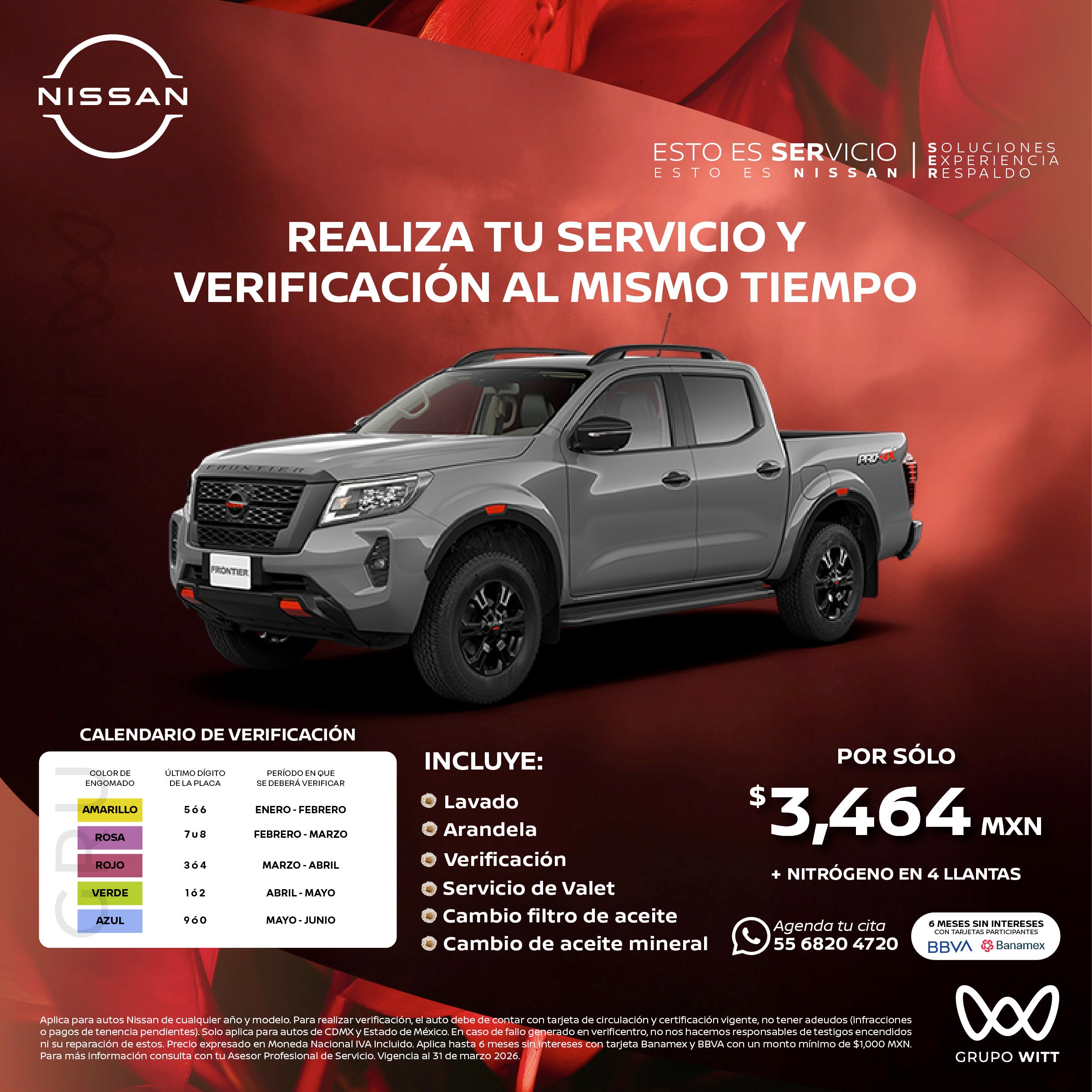 Aplica para autos Nissan de cualquier ano y modelo. Para realizar verificación, el auto debe de contar con tarjeta de circulación y certificación vigente, no tener adeudos (Infracciones o pagos de tenencia pendientes). Solo aplica para autos de CDMX y Estado de México. En caso de fallo generado en verificentro, no nos hacemos responsables de testigos encendidos ni su reparación de estos. Precio expresado en Moneda Nacional IVA Incluido. Aplica hasta 6 meses sin Intereses con tarjeta Banamex y BBVA con un monto mínimo de $1,000 MXN. Para más Información consulta con tu Asesor Profesional de Servicio. Vigencia al 31 de marzo 2026.