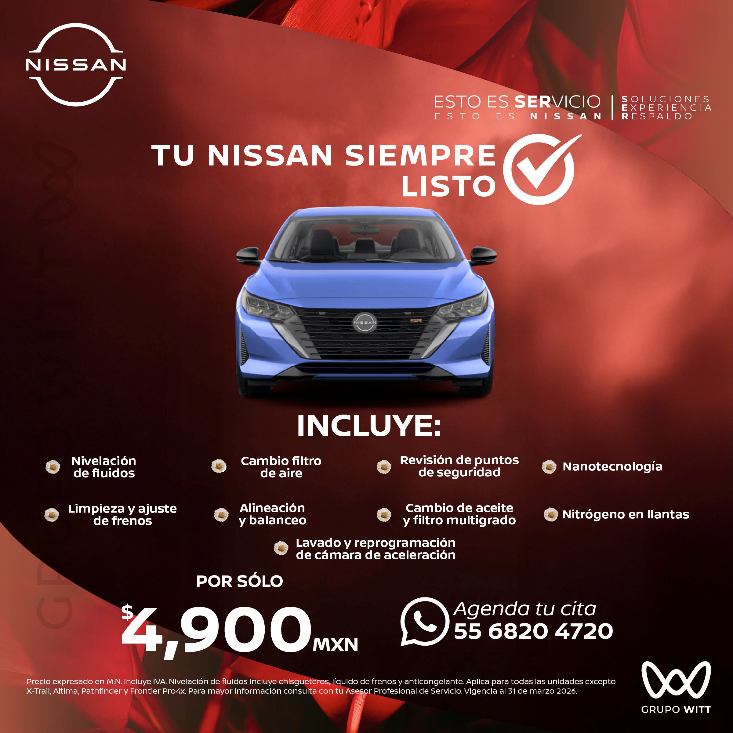 Precio expresado en M.N. incluye IVA. Nivelación de fluidos incluye chisgueteros, líquido de frenos y anticongelante. Aplica para todas las unidades excepto X-Trail, Altima, Pathfinder y Frontier Pro4x. Para mayor información consulta con tu Asesor Profesional de Servicio. Vigencia al 31 de marzo 2026.